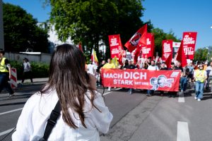 Selbstbewusst liefen die Demoteilnehmer:innen hinter dem Transparent des DGB. Ergänzt wurde die vom DGB ausgerufene Parole „Mach dich stark – mit uns“ durch eigens angefertigte Standarten, auf denen Losungen wie „Für eine proletarische Demokratie statt der die Diktatur der Bosse!“ oder „Für Streik gegen Entlassungen statt „Sozial“plan!“ zu lesen waren und somit der Demonstration einen tatsächlich politischen Ausdruck verleihen konnten.